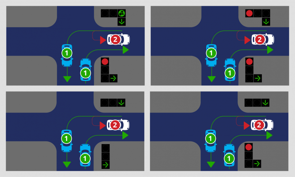 Išimtis. Apsisukantis vairuotojas turės pirmumą vieninteliu retai pasitaikančiu atveju – kai į dešinę sukama degant draudžiamam raudonam šviesoforo signalui, ties kuriuo pritvirtinta lentelė su žalia rodykle. Tokiu atveju į dešinę sukantis vairuotojas privalo praleisti visus eismo dalyvius, kurių judėjimo kryptį kerta.