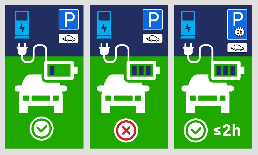 KET 153.1 p. Elektromobilio arba grynojo elektromobilio (toliau – elektromobilis), kurio įkrovimas baigtas, vairuotojas turi nedelsdamas patraukti transporto priemonę iš elektromobilių įkrovimo vietos, jeigu kelio ženklas „Stovėjimo ribotą laiką vieta“ nenurodo kitaip.
