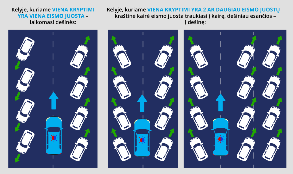 KET 12 p. Eismo dalyviai privalo nedelsdami duoti kelią artėjančioms specialiosioms transporto priemonėms su įjungtais mėlynais ir raudonais (arba tik mėlynais) švyturėliais ir specialiaisiais garso signalais ir jų lydimoms transporto priemonėms. Artėjančioms specialiosioms transporto priemonėms su įjungtais mėlynais ir raudonais (arba tik mėlynais) švyturėliais ir specialiaisiais garso signalais ir jų lydimoms transporto priemonėms kelias duodamas ir avarinis koridorius sudaromas tokia tvarka: